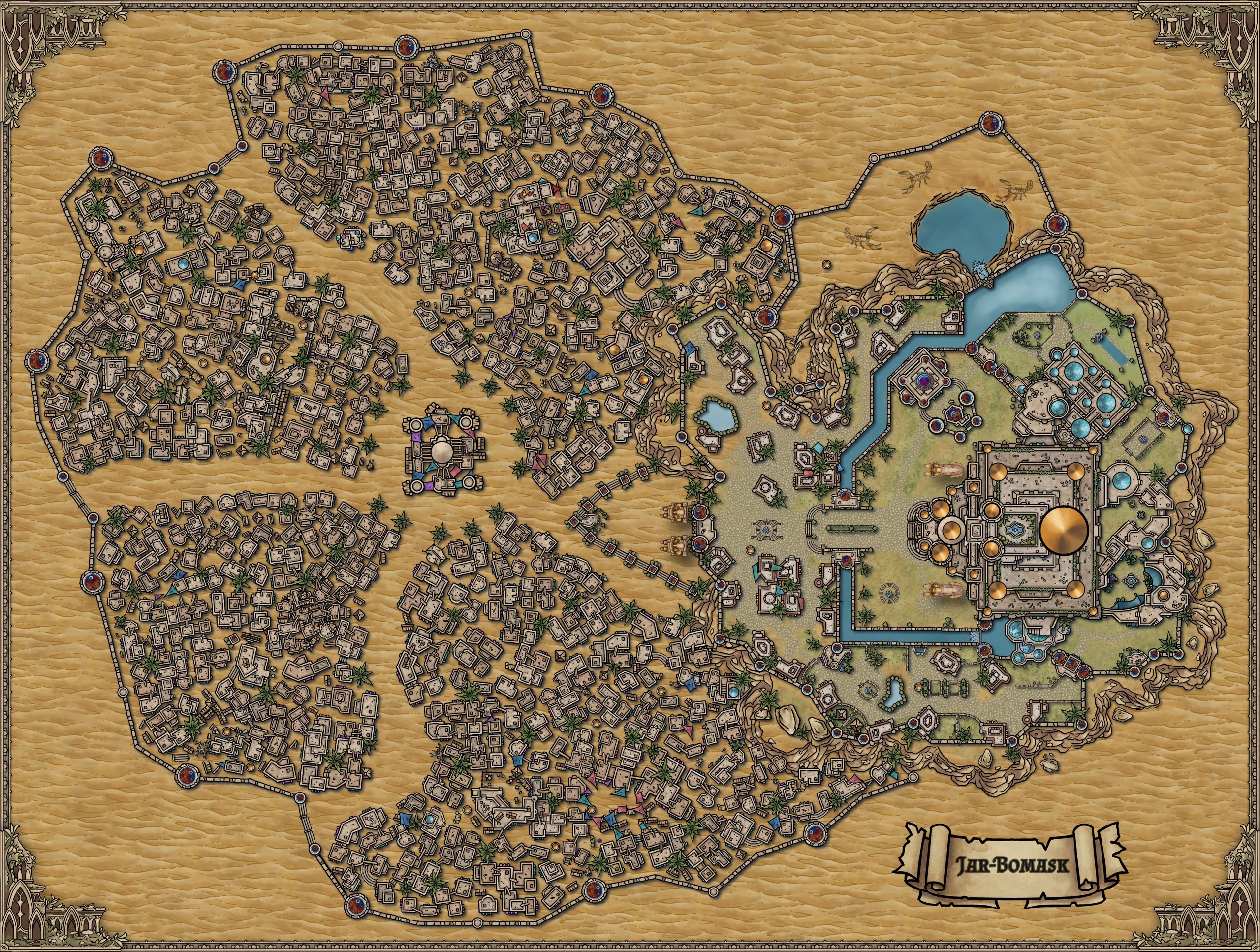 Jar-Bomask, la última ciudad antes de llegar a la zona pantanosa que se extiende en las tierras más allá del desierto. Esta ciudad pertenece al Imperio de las Arenas y es conocida por su célebre ejército: los Jinetes de Escorpiones.