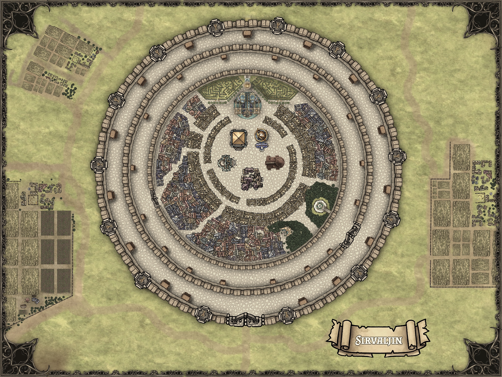 Tres filas de enormes murallas de piedra cincelada se erigen como montañas a ojos de cualquier mortal como baluarte defensivo de la ciudad, que alberga edificios legendarios como el Hospital Lubriej o la Gran Biblioteca Dorada. La estructura en forma de anillos concéntricos de la ciudad otorga una defensa prácticamente inexpugnable a los edificios emblemáticos de la ciudad.
